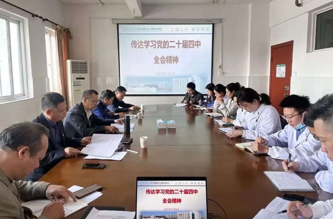 会议强调,全院上下要坚决贯彻落实党中央、省委、市委、学校党委的部署要求,把学习好贯彻好党的二十届四中全会精神作为当前和今后一个时期的重大政治任务,迅速掀起学习贯彻全会精神的热潮,精心组织传达学习,确保全会精神在医院落地生根、见行见效。