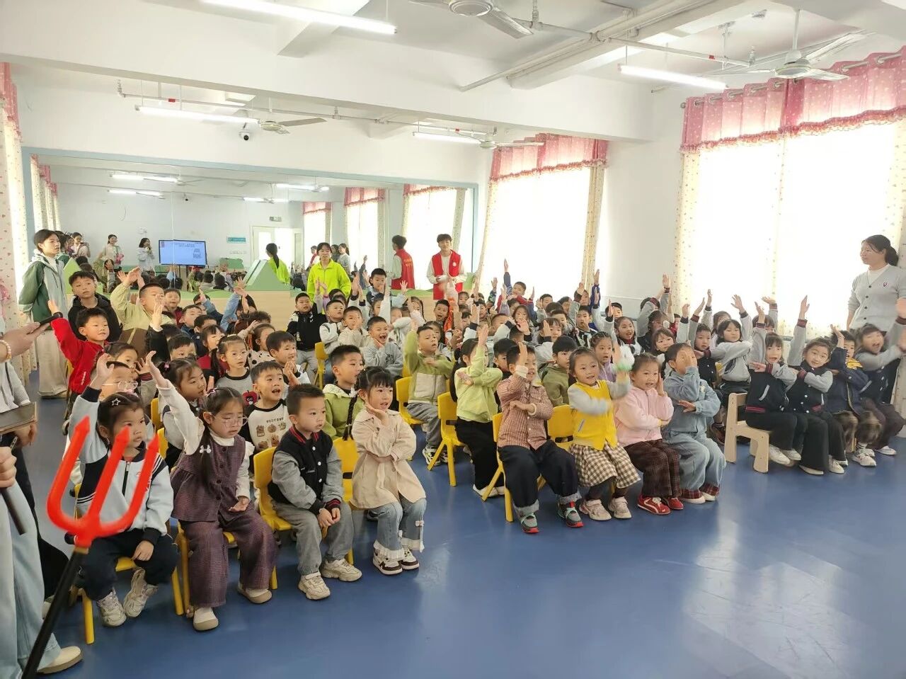 面向大班幼儿,宣讲队升级情景剧形式,融入更多趣味互动环节,宣讲队员与大班孩子默契配合,生动演绎“牙齿保卫战”场景,将蛀牙形成、科学护齿等知识点融入剧情细节。孩子们踊跃参与剧情互动,主动举手分享自己的护齿小技巧,时不时跟着宣讲队员模仿正确刷牙动作,脸上满是专注与喜悦,在欢声笑语中深化对护齿知识的理解和记忆。