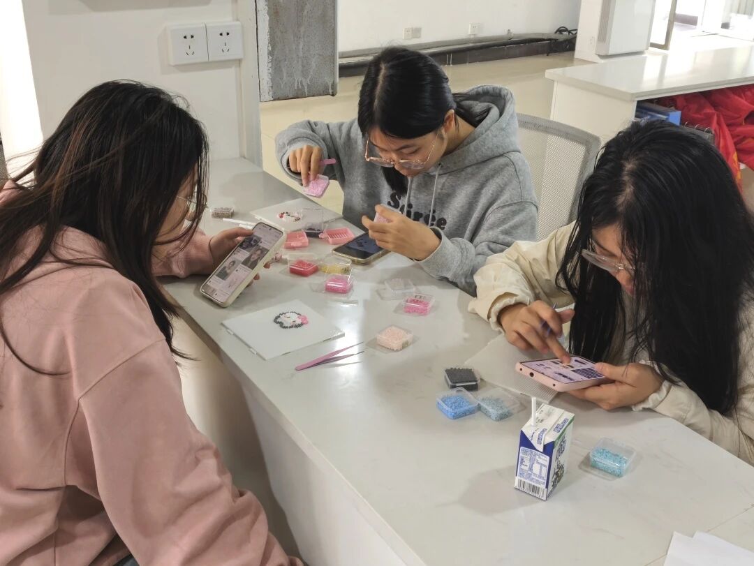 活动当天,两个校区的活动现场都热闹非凡,同学们早早来到活动场地,迫不及待地开始了拼豆创作。现场摆放着满满当当的拼豆材料,各种颜色的拼豆被整齐地收纳在透明盒子中,色彩丰富多样,为同学们的创作提供了充足的素材。