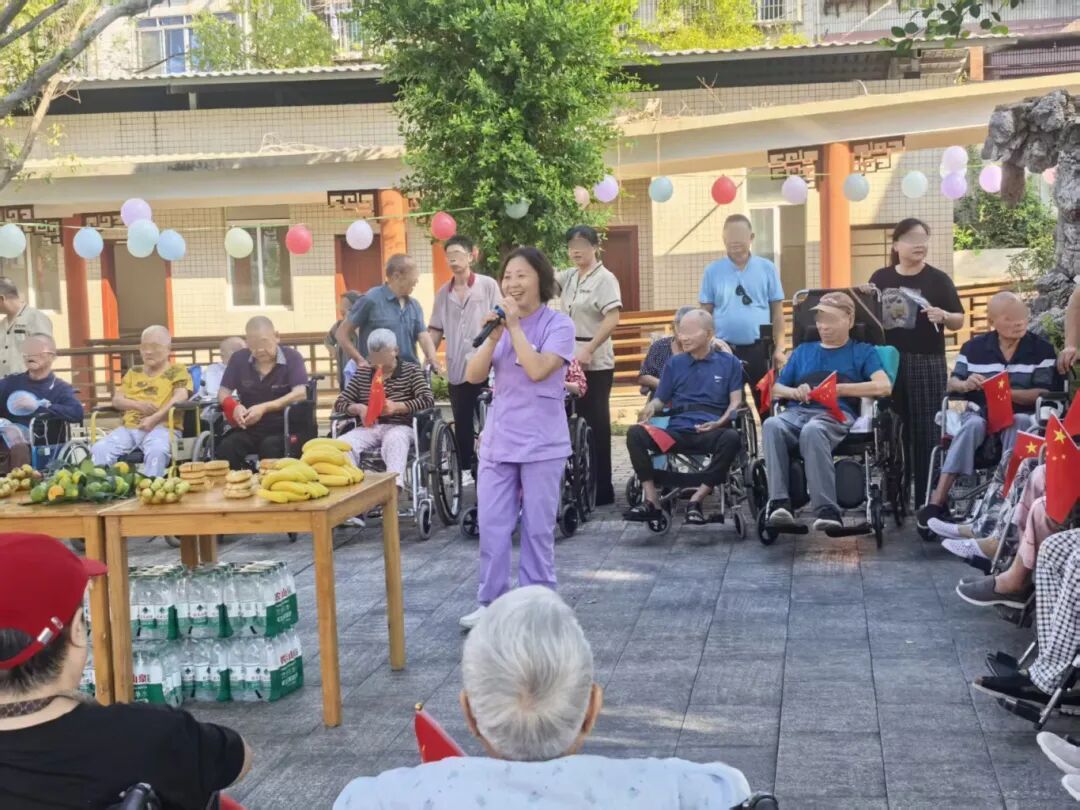 今天的中心热闹非凡,一个个精彩的节目轮番登场,医养中心护士长黄姝红带来的《今天是你的生日,我的中国》拉开了帷幕,引发了老人们的共鸣,大家纷纷手摇国旗,跟着节奏轻轻哼唱,有的还忍不住热泪盈眶,感叹祖国的美好,感叹党的伟大。