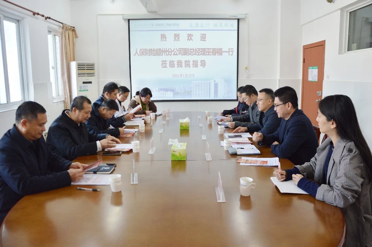为进一步加强医险协同,优化服务流程,拓展合作领域,1月29日上午,我院与中国人保财险赣州分公司召开合作洽谈会。医院党委书记林金秤,院长邓炜,党委委员、副院长刘晓春及相关科室负责人,与人保财险赣州分公司副总经理巫春福、理赔中心执行主任郭军等一行,就双方合作情况、现存问题及未来深化方向进行了深入交流。