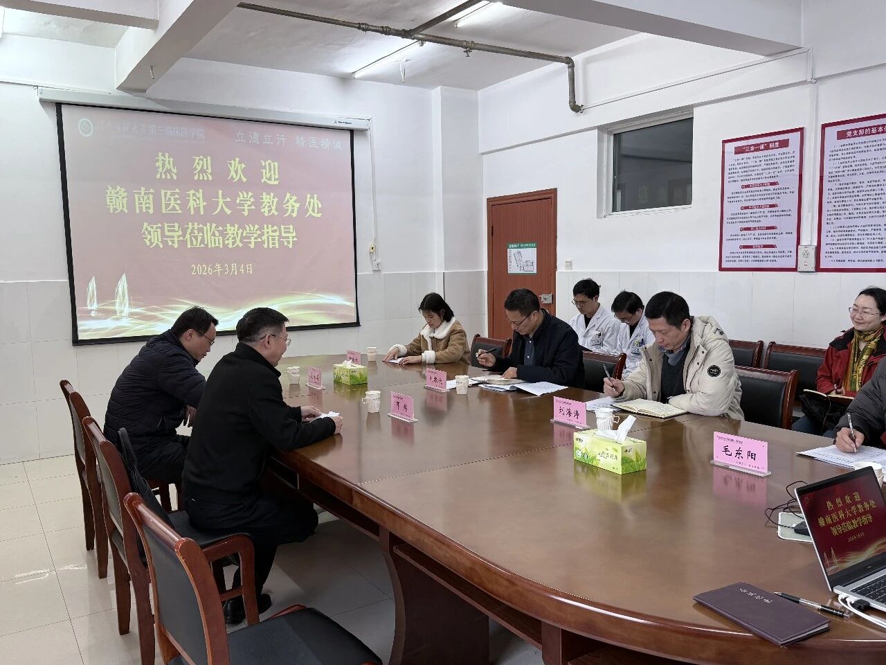 3月4日,赣南医科大学教务处副处长刘振优一行莅临我院,就教学档案建设与教学运行情况进行专项检查与指导。此次检查旨在进一步加强教学过程管理,持续提升医学人才培养质量。我院院长邓炜,党委委员、副院长凌永昌,教科办全体人员、各教研室主任及秘书陪同检查并参与座谈。