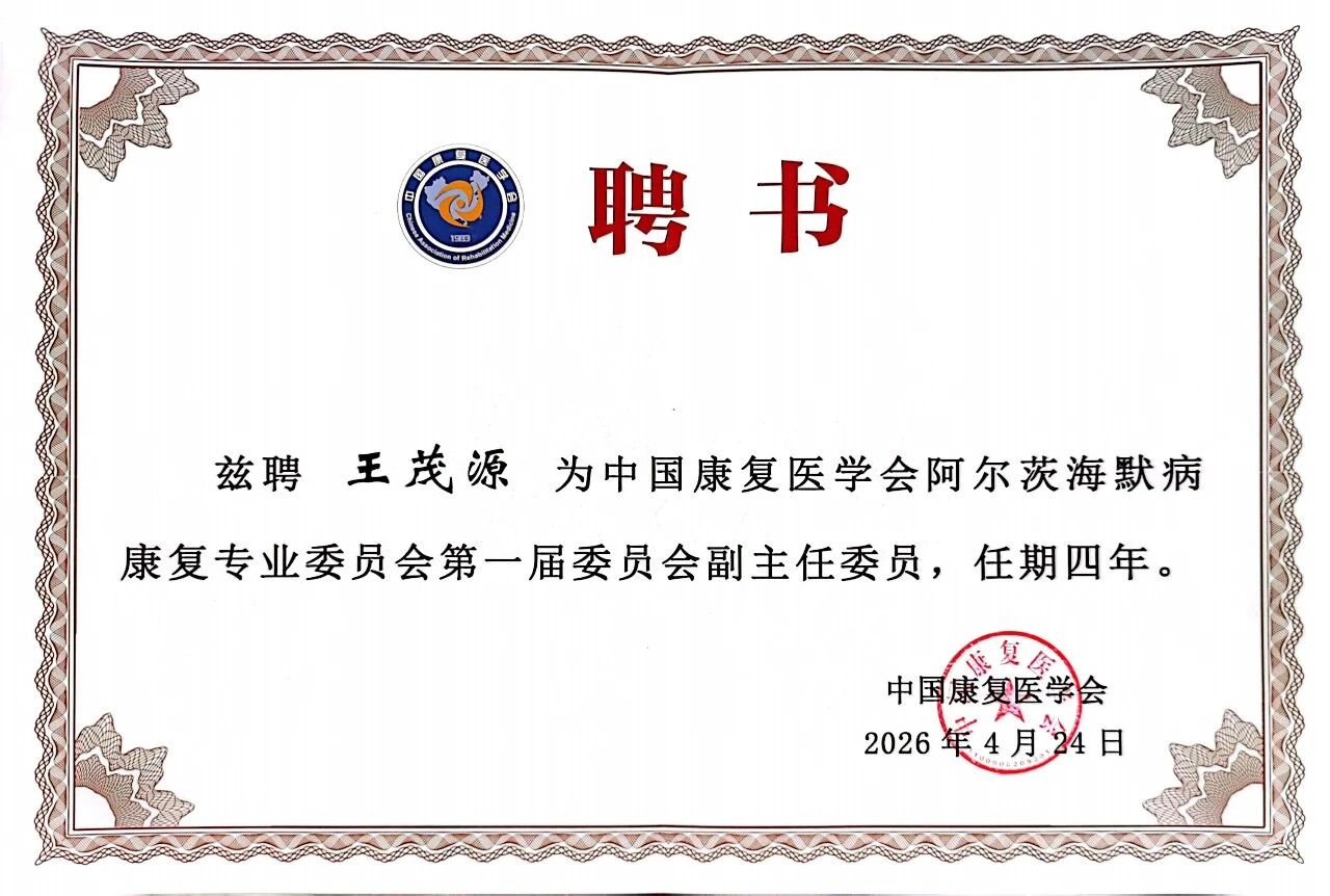赣医大三附院(口腔医院丨康复医院)党委书记王茂源博士凭借在阿尔茨海默病康复治疗的实绩、康复管理及学科建设方面的突出贡献与广泛影响力,成功当选为中国康复医学会阿尔茨海默病康复专业委员会第一届委员会副主任委员。